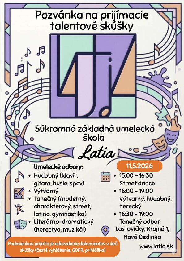 S radosťou vás pozývame na Prijímacie talentové skúšky v SZUŠ Latia, kde si vaše deti môžu vyskúšať všetky študijné zamerania, ktoré budeme otvárať od septembra 2026. Príďte sa pozrieť, zažiť jedinečnú atmosféru a objaviť svet umenia!